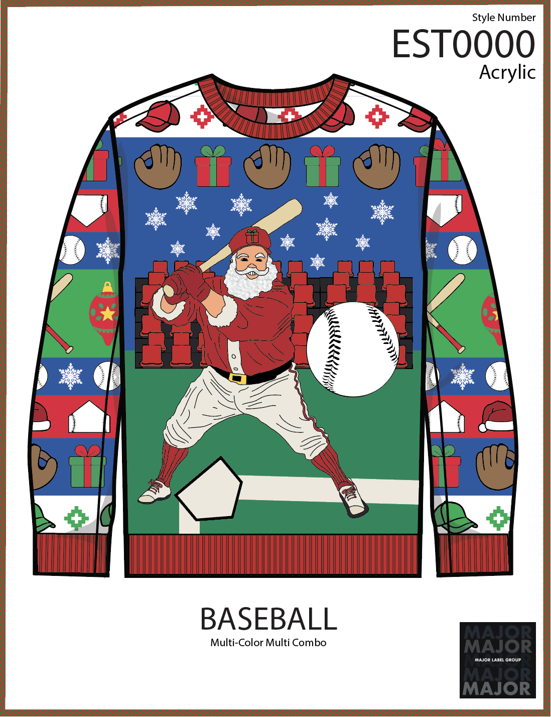 Multi-Color Combo– Stadium-inspired Santa batting scene with structured pattern sleeves.
